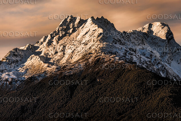 Strong sunsetting light colors the prominent peaks of huge alpine range. by Mal Austin