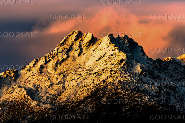 Strong sunsetting light colors the prominent peaks of huge alpine range. by Mal Austin