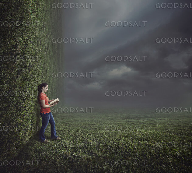 A woman leans against a grassy wall and reads her Bible by Kevin Carden