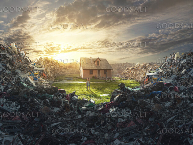 A house is surrounded by piles and piles of junk and garbage. by Kevin Carden