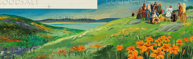 Jesus teaches the disciples and a group of people on a hillside covered in flowers. Horizontal format. by Review & Herald Publishing