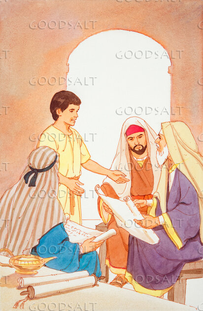 Young Jesus speaks with the religious leaders in the temple in Jerusalem. by Lifeway Collection