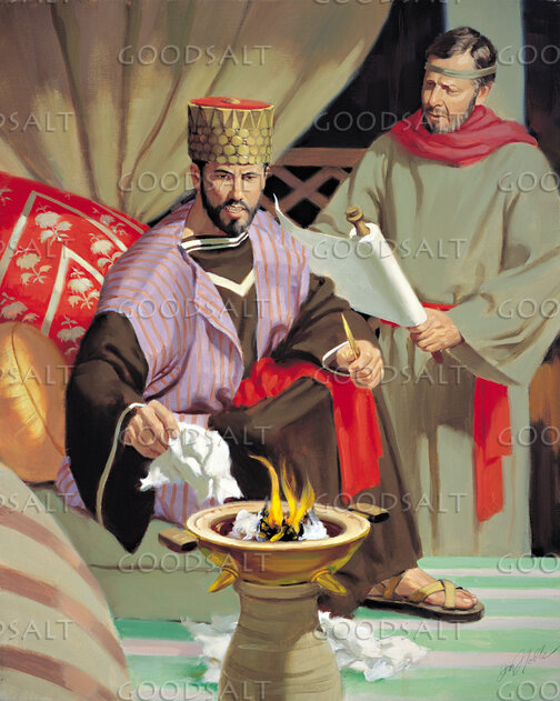 Jeremiah is in the upper right corner of the picture. He is holding a scroll he has prepared for the King. It is obvious that the king is upset. The king has rolled parts of the scroll into wads of parchment and is burning them right before Jeremiah's eyes.