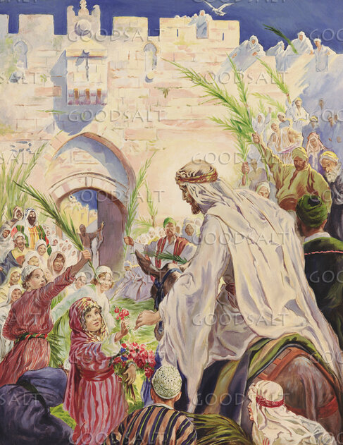John 1212 The next day the large crowd that had come to the feast heard that Jesus was coming to Jerusalem.13 So they took branches of palm trees and went out to meet him, crying out, “Hosanna! Blessed is he who comes in the name of the Lord, even the King of Israel!”14 And Jesus found a young donkey and sat on it, just as it is written,15 “Fear not, daughter of Zion; behold, your king is coming, sitting on a donkey's colt!”16 His disciples did not understand these things at first, but when Jesus was glorified, then they remembered that these things had been written about him and had been done to him.17 The crowd that had been with him when he called Lazarus out of the tomb and raised him from the dead continued to bear witness.18 The reason why the crowd went to meet him was that they heard he had done this sign.19 So the Pharisees said to one another, “You see that you are gaining nothing. Look, the world has gone after him.” Luke 1928 And when he had said these things, he went on ahead, going up to Jerusalem.29 When he drew near to Bethphage and Bethany, at the mount that is called Olivet, he sent two of the disciples,30 saying, “Go into the village in front of you, where on entering you will find a colt tied, on which no one has ever yet sat. Untie it and bring it here.31 If anyone asks you, ‘Why are you untying it?’ you shall say this: ‘The Lord has need of it.’”32 So those who were sent went away and found it just as he had told them.33 And as they were untying the colt, its owners said to them, “Why are you untying the colt?”34 And they said, “The Lord has need of it.”35 And they brought it to Jesus, and throwing their cloaks on the colt, they set Jesus on it.36 And as he rode along, they spread their cloaks on the road.37 As he was drawing near—already on the way down the Mount of Olives—the whole multitude of his disciples began to rejoice and praise God with a loud voice for all the mighty works that they had seen,38 saying, “Blessed is the King who comes in the name of the Lord! Peace in heaven and glory in the highest!”39 And some of the Pharisees in the crowd said to him, “Teacher, rebuke your disciples.”40 He answered, “I tell you, if these were silent, the very stones would cry out.”41 And when he drew near and saw the city, he wept over it,42 saying, “Would that you, even you, had known on this day the things that make for peace! But now they are hidden from your eyes.43 For the days will come upon you, when your enemies will set up a barricade around you and surround you and hem you in on every side44 and tear you down to the ground, you and your children within you. And they will not leave one stone upon another in you, because you did not know the time of your visitation.” Mark 111 Now when they drew near to Jerusalem, to Bethphage and Bethany, at the Mount of Olives, Jesus sent two of his disciples2 and said to them, “Go into the village in front of you, and immediately as you enter it you will find a colt tied, on which no one has ever sat. Untie it and bring it.3 If anyone says to you, ‘Why are you doing this?’ say, ‘The Lord has need of it and will send it back here immediately.’”4 And they went away and found a colt tied at a door outside in the street, and they untied it.5 And some of those standing there said to them, “What are you doing, untying the colt?”6 And they told them what Jesus had said, and they let them go.7 And they brought the colt to Jesus and threw their cloaks on it, and he sat on it.8 And many spread their cloaks on the road, and others spread leafy branches that they had cut from the fields.9 And those who went before and those who followed were shouting, “Hosanna! Blessed is he who comes in the name of the Lord!10 Blessed is the coming kingdom of our father David! Hosanna in the highest!”11 And he entered Jerusalem and went into the temple. And when he had looked around at everything, as it was already late, he went out to Bethany with the twelve. Matthew 211 Now when they drew near to Jerusalem and came to Bethphage, to the Mount of Olives, then Jesus sent two disciples,2 saying to them, “Go into the village in front of you, and immediately you will find a donkey tied, and a colt with her. Untie them and bring them to me.3 If anyone says anything to you, you shall say, ‘The Lord needs them,’ and he will send them at once.”4 This took place to fulfill what was spoken by the prophet, saying,5 “Say to the daughter of Zion, ‘Behold, your king is coming to you, humble, and mounted on a donkey, and on a colt, the foal of a beast of burden.’”6 The disciples went and did as Jesus had directed them.7 They brought the donkey and the colt and put on them their cloaks, and he sat on them.8 Most of the crowd spread their cloaks on the road, and others cut branches from the trees and spread them on the road.9 And the crowds that went before him and that followed him were shouting, “Hosanna to the Son of David! Blessed is he who comes in the name of the Lord! Hosanna in the highest!”10 And when he entered Jerusalem, the whole city was stirred up, saying, “Who is this?”11 And the crowds said, “This is the prophet Jesus, from Nazareth of Galilee.” | |