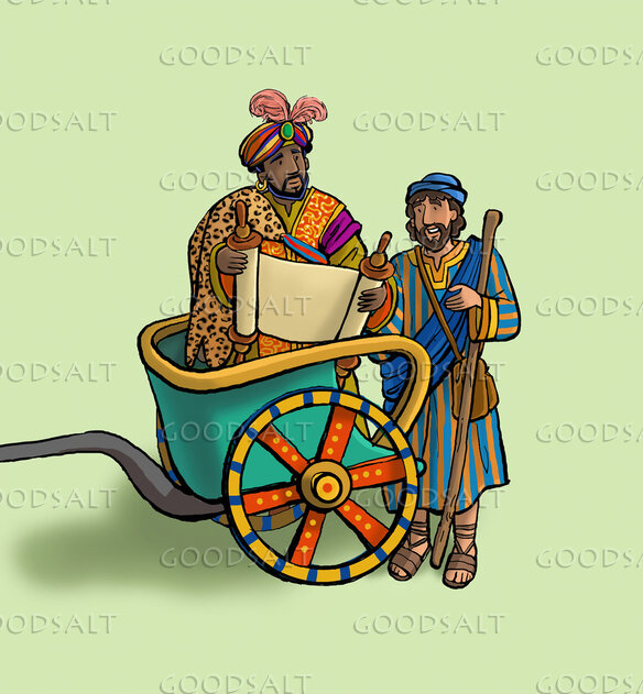 Philip explains the message of the Good News from the scroll of Isaiah to the Ethiopian Eunuch that centers on Jesus coming as the Messiah and that scripture prophecy of Jesus\' ministry. The heart of the Ethiopian royal official is moved and he accepts Jesus as his savior. Heavy line style. Children\'s division.