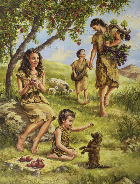 Adam and Eve are in an open area with Cain and Abel. Adam and Cain carry fruit as they walk toward Eve. Abel plays nearby. by Lifeway Collection