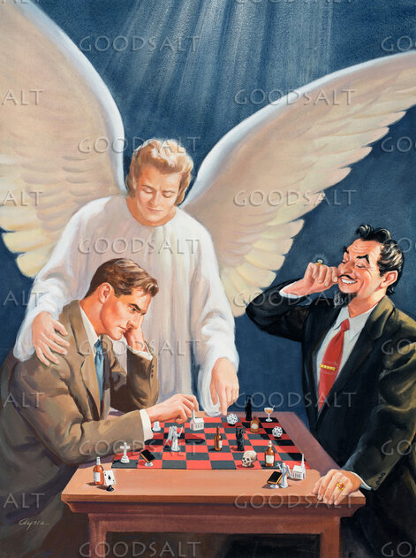 An angel giving guidance in a metaphysical game of life chess with Satan by Review & Herald Publishing