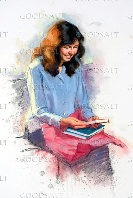 A woman happily opens a gift of books. by Bjorn Thorkelson