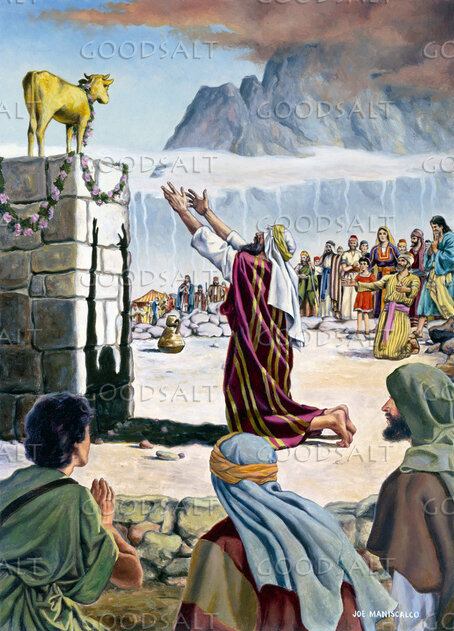 1 When the people saw that Moses delayed to come down from the mountain, the people gathered themselves together to Aaron and said to him, “Up, make us gods who shall go before us. As for this Moses, the man who brought us up out of the land of Egypt, we do not know what has become of him.”2 So Aaron said to them, “Take off the rings of gold that are in the ears of your wives, your sons, and your daughters, and bring them to me.”3 So all the people took off the rings of gold that were in their ears and brought them to Aaron.4 And he received the gold from their hand and fashioned it with a graving tool and made a golden calf. And they said, “These are your gods, O Israel, who brought you up out of the land of Egypt!”