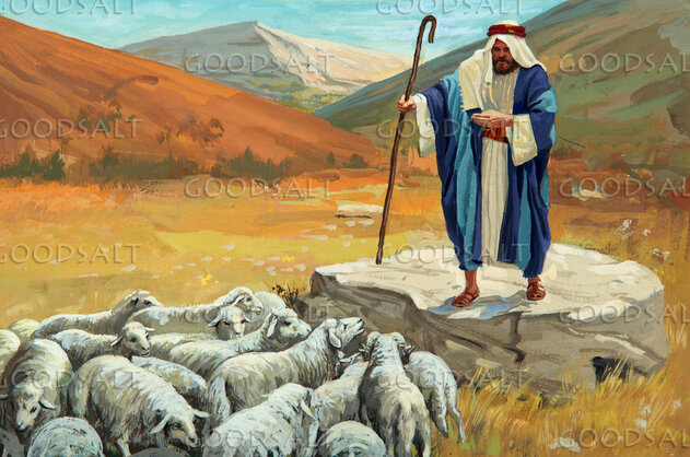Shepherd standing on rock before sheep. by Review & Herald Publishing