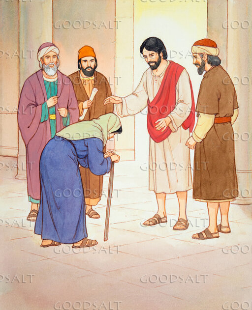 11 And there was a woman who had had a disabling spirit for eighteen years. She was bent over and could not fully straighten herself.12 When Jesus saw her, he called her over and said to her, “Woman, you are freed from your disability.”13 And he laid his hands on her, and immediately she was made straight, and she glorified God.