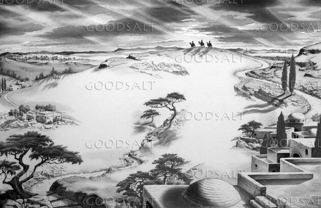Overview scene of some part of Israel, with the silhouette of three men on camels on the horizon. by IDEALS Collections