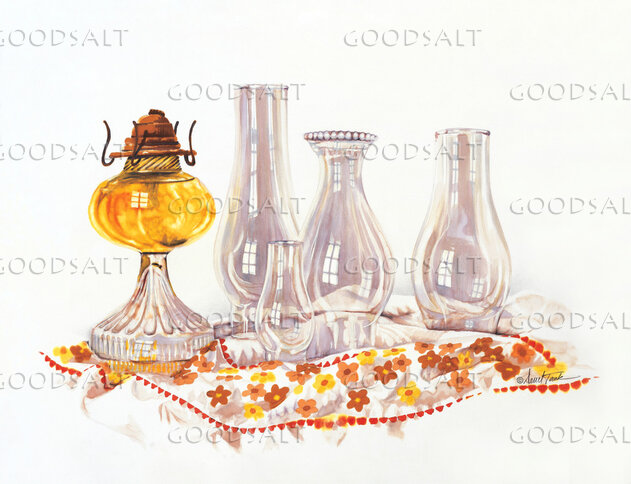 An oil lamp, with a variety of glass tops. by Darrel Tank