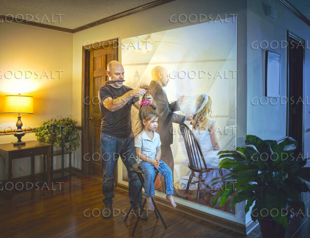 A father does his young daughter's hair. In a mirrir reflection, he arranges her wedding veil. by Kevin Carden