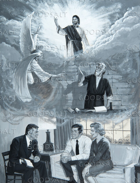 Man explains to couple how Word of God was revealed by Review & Herald Publishing