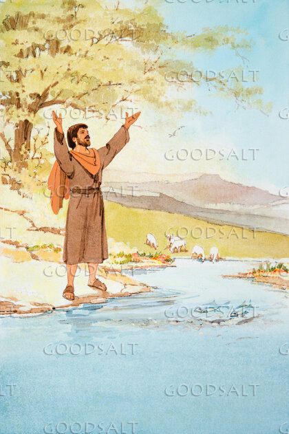 A holy man gives thanks to God by a stream with fish. sheep are grazing in the background. by Lifeway Collection