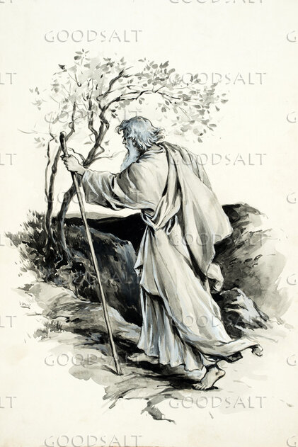 A prophet or Patriarch walks purposefully on. Grayscale image. by Review & Herald Publishing