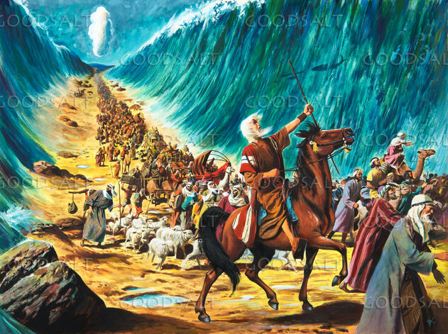 Moses leading the Israelites through the parted Red Sea; Moses is depicted here riding a horse with a cane in his hand. Crowds of people are moving forward as far as the eye can see. There are walls of water on either side.