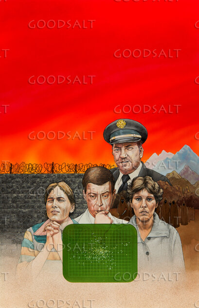 Modern people in a story, showing man praying, a scientist or medical professional, a woman and a man in uniform, collage in front of a barbed wire topped wall and hooded monks and mountains in the background. Orange sky. Book cover style art. by Review & Herald Publishing