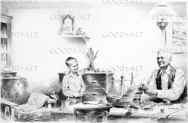 A grandfather finished a model ship, his grandsom looks on. by IDEALS Collections