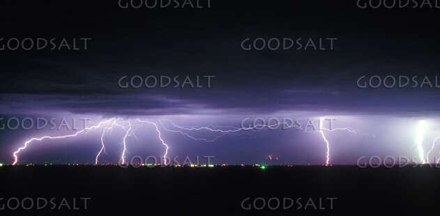 Many lightning bolts shooting across a dark sky. by John Clement
