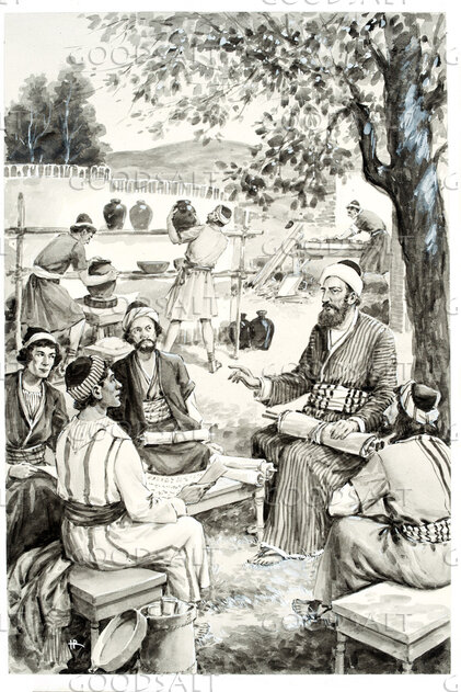 An Apostle teaches a group of men from scrolls. Servants work in the background. Grayscale painting by Review & Herald Publishing