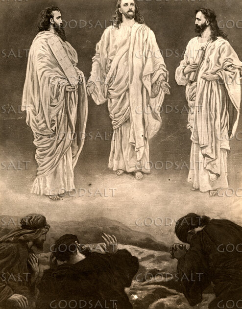 28 Now about eight days after these sayings he took with him Peter and John and James and went up on the mountain to pray.29 And as he was praying, the appearance of his face was altered, and his clothing became dazzling white.30 And behold, two men were talking with him, Moses and Elijah,31 who appeared in glory and spoke of his departure, which he was about to accomplish at Jerusalem.32 Now Peter and those who were with him were heavy with sleep, but when they became fully awake they saw his glory and the two men who stood with him.33 And as the men were parting from him, Peter said to Jesus, “Master, it is good that we are here. Let us make three tents, one for you and one for Moses and one for Elijah”—not knowing what he said.34 As he was saying these things, a cloud came and overshadowed them, and they were afraid as they entered the cloud.35 And a voice came out of the cloud, saying, “This is my Son, my Chosen One; listen to him!”36 And when the voice had spoken, Jesus was found alone. And they kept silent and told no one in those days anything of what they had seen.