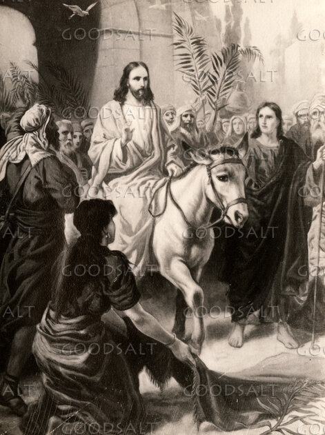John 1212 The next day the large crowd that had come to the feast heard that Jesus was coming to Jerusalem.13 So they took branches of palm trees and went out to meet him, crying out, “Hosanna! Blessed is he who comes in the name of the Lord, even the King of Israel!”14 And Jesus found a young donkey and sat on it, just as it is written,15 “Fear not, daughter of Zion; behold, your king is coming, sitting on a donkey's colt!”16 His disciples did not understand these things at first, but when Jesus was glorified, then they remembered that these things had been written about him and had been done to him.17 The crowd that had been with him when he called Lazarus out of the tomb and raised him from the dead continued to bear witness.18 The reason why the crowd went to meet him was that they heard he had done this sign.19 So the Pharisees said to one another, “You see that you are gaining nothing. Look, the world has gone after him.” Luke 1928 And when he had said these things, he went on ahead, going up to Jerusalem.29 When he drew near to Bethphage and Bethany, at the mount that is called Olivet, he sent two of the disciples,30 saying, “Go into the village in front of you, where on entering you will find a colt tied, on which no one has ever yet sat. Untie it and bring it here.31 If anyone asks you, ‘Why are you untying it?’ you shall say this: ‘The Lord has need of it.’”32 So those who were sent went away and found it just as he had told them.33 And as they were untying the colt, its owners said to them, “Why are you untying the colt?”34 And they said, “The Lord has need of it.”35 And they brought it to Jesus, and throwing their cloaks on the colt, they set Jesus on it.36 And as he rode along, they spread their cloaks on the road.37 As he was drawing near—already on the way down the Mount of Olives—the whole multitude of his disciples began to rejoice and praise God with a loud voice for all the mighty works that they had seen,38 saying, “Blessed is the King who comes in the name of the Lord! Peace in heaven and glory in the highest!”39 And some of the Pharisees in the crowd said to him, “Teacher, rebuke your disciples.”40 He answered, “I tell you, if these were silent, the very stones would cry out.”41 And when he drew near and saw the city, he wept over it,42 saying, “Would that you, even you, had known on this day the things that make for peace! But now they are hidden from your eyes.43 For the days will come upon you, when your enemies will set up a barricade around you and surround you and hem you in on every side44 and tear you down to the ground, you and your children within you. And they will not leave one stone upon another in you, because you did not know the time of your visitation.” Mark 111 Now when they drew near to Jerusalem, to Bethphage and Bethany, at the Mount of Olives, Jesus sent two of his disciples2 and said to them, “Go into the village in front of you, and immediately as you enter it you will find a colt tied, on which no one has ever sat. Untie it and bring it.3 If anyone says to you, ‘Why are you doing this?’ say, ‘The Lord has need of it and will send it back here immediately.’”4 And they went away and found a colt tied at a door outside in the street, and they untied it.5 And some of those standing there said to them, “What are you doing, untying the colt?”6 And they told them what Jesus had said, and they let them go.7 And they brought the colt to Jesus and threw their cloaks on it, and he sat on it.8 And many spread their cloaks on the road, and others spread leafy branches that they had cut from the fields.9 And those who went before and those who followed were shouting, “Hosanna! Blessed is he who comes in the name of the Lord!10 Blessed is the coming kingdom of our father David! Hosanna in the highest!”11 And he entered Jerusalem and went into the temple. And when he had looked around at everything, as it was already late, he went out to Bethany with the twelve. Matthew 211 Now when they drew near to Jerusalem and came to Bethphage, to the Mount of Olives, then Jesus sent two disciples,2 saying to them, “Go into the village in front of you, and immediately you will find a donkey tied, and a colt with her. Untie them and bring them to me.3 If anyone says anything to you, you shall say, ‘The Lord needs them,’ and he will send them at once.”4 This took place to fulfill what was spoken by the prophet, saying,5 “Say to the daughter of Zion, ‘Behold, your king is coming to you, humble, and mounted on a donkey, and on a colt, the foal of a beast of burden.’”6 The disciples went and did as Jesus had directed them.7 They brought the donkey and the colt and put on them their cloaks, and he sat on them.8 Most of the crowd spread their cloaks on the road, and others cut branches from the trees and spread them on the road.9 And the crowds that went before him and that followed him were shouting, “Hosanna to the Son of David! Blessed is he who comes in the name of the Lord! Hosanna in the highest!”10 And when he entered Jerusalem, the whole city was stirred up, saying, “Who is this?”11 And the crowds said, “This is the prophet Jesus, from Nazareth of Galilee.” | |