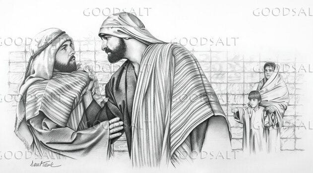 One man grabs another by the tunic, making threats or demands. This cold be the unforgiving servant. by Darrel Tank