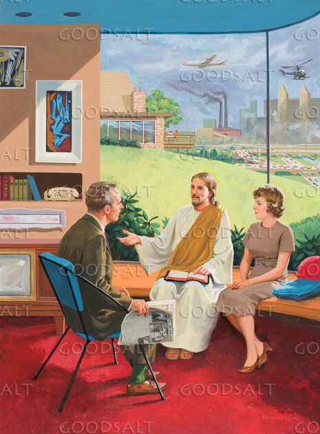 Vintage illustration of Jesus visiting a modern era couple in their living room. A modern city is in the background. Circa 1960's. by Review & Herald Publishing