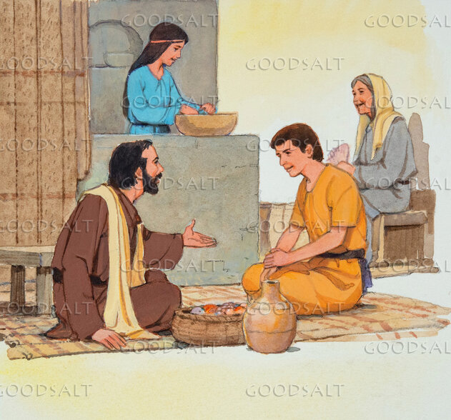 An apostle visits with a family. It could be Peter or Paul. by Lifeway Collection