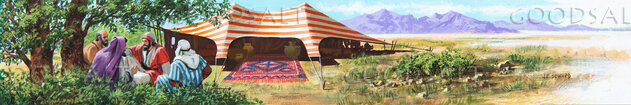 The Lord appeared to Abraham while he was sitting near the entrance to his tent. Abraham saw men standing nearby.He hurried to meet them and bowed low. He said he wanted to give them something to eat and water to wash their feet. He stood near them as they ate. The picture shows four men sitting under the tree relaxing. There is a large tent in the background with a large rug leading into it.