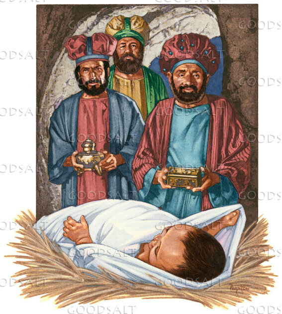 The three wise men present their gifts to baby Jesus. by Jeff Preston