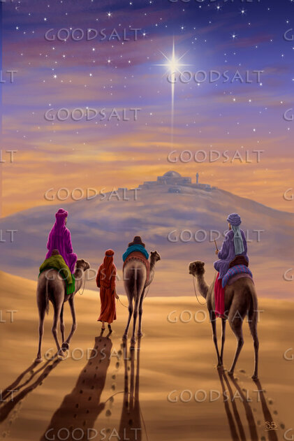 The three wise men on the way to Bethlehem with the city in the distance against a sunset sky with the star above by Steve Bridger