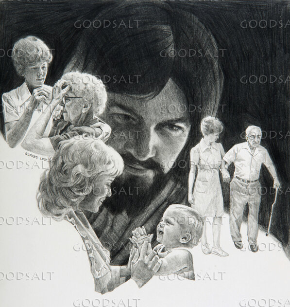 Jesus in background as people provide caring and medical missionary support, a mother with a child, a senior being assisted. Love in motion. Black and white graphite pencil illustration.