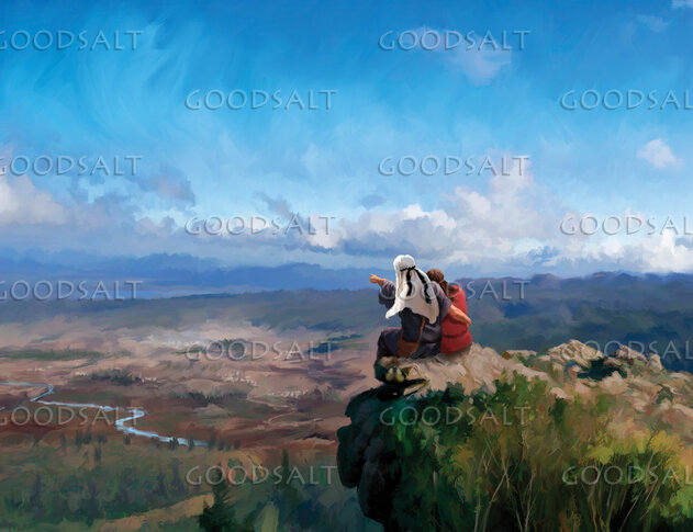 A couple sit on a cliff overlooking the landscape. by General Conference