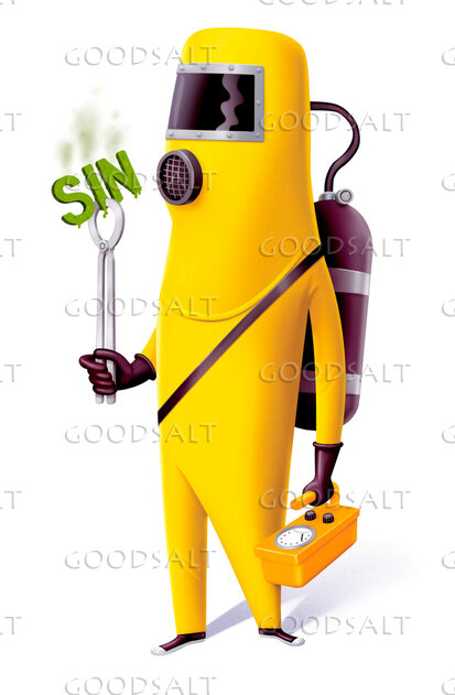 Person wearing hazmat suit and geiger counter holding toxic, green, slimey "SIN" by Krieg Barrie