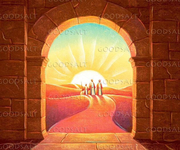 travelers approach arched gate at sunrise by Krieg Barrie