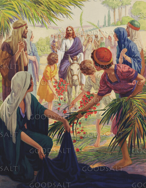 John 1212 The next day the large crowd that had come to the feast heard that Jesus was coming to Jerusalem.13 So they took branches of palm trees and went out to meet him, crying out, “Hosanna! Blessed is he who comes in the name of the Lord, even the King of Israel!”14 And Jesus found a young donkey and sat on it, just as it is written,15 “Fear not, daughter of Zion; behold, your king is coming, sitting on a donkey's colt!”16 His disciples did not understand these things at first, but when Jesus was glorified, then they remembered that these things had been written about him and had been done to him.17 The crowd that had been with him when he called Lazarus out of the tomb and raised him from the dead continued to bear witness.18 The reason why the crowd went to meet him was that they heard he had done this sign.19 So the Pharisees said to one another, “You see that you are gaining nothing. Look, the world has gone after him.” Luke 1928 And when he had said these things, he went on ahead, going up to Jerusalem.29 When he drew near to Bethphage and Bethany, at the mount that is called Olivet, he sent two of the disciples,30 saying, “Go into the village in front of you, where on entering you will find a colt tied, on which no one has ever yet sat. Untie it and bring it here.31 If anyone asks you, ‘Why are you untying it?’ you shall say this: ‘The Lord has need of it.’”32 So those who were sent went away and found it just as he had told them.33 And as they were untying the colt, its owners said to them, “Why are you untying the colt?”34 And they said, “The Lord has need of it.”35 And they brought it to Jesus, and throwing their cloaks on the colt, they set Jesus on it.36 And as he rode along, they spread their cloaks on the road.37 As he was drawing near—already on the way down the Mount of Olives—the whole multitude of his disciples began to rejoice and praise God with a loud voice for all the mighty works that they had seen,38 saying, “Blessed is the King who comes in the name of the Lord! Peace in heaven and glory in the highest!”39 And some of the Pharisees in the crowd said to him, “Teacher, rebuke your disciples.”40 He answered, “I tell you, if these were silent, the very stones would cry out.”41 And when he drew near and saw the city, he wept over it,42 saying, “Would that you, even you, had known on this day the things that make for peace! But now they are hidden from your eyes.43 For the days will come upon you, when your enemies will set up a barricade around you and surround you and hem you in on every side44 and tear you down to the ground, you and your children within you. And they will not leave one stone upon another in you, because you did not know the time of your visitation.” Mark 111 Now when they drew near to Jerusalem, to Bethphage and Bethany, at the Mount of Olives, Jesus sent two of his disciples2 and said to them, “Go into the village in front of you, and immediately as you enter it you will find a colt tied, on which no one has ever sat. Untie it and bring it.3 If anyone says to you, ‘Why are you doing this?’ say, ‘The Lord has need of it and will send it back here immediately.’”4 And they went away and found a colt tied at a door outside in the street, and they untied it.5 And some of those standing there said to them, “What are you doing, untying the colt?”6 And they told them what Jesus had said, and they let them go.7 And they brought the colt to Jesus and threw their cloaks on it, and he sat on it.8 And many spread their cloaks on the road, and others spread leafy branches that they had cut from the fields.9 And those who went before and those who followed were shouting, “Hosanna! Blessed is he who comes in the name of the Lord!10 Blessed is the coming kingdom of our father David! Hosanna in the highest!”11 And he entered Jerusalem and went into the temple. And when he had looked around at everything, as it was already late, he went out to Bethany with the twelve. Matthew 211 Now when they drew near to Jerusalem and came to Bethphage, to the Mount of Olives, then Jesus sent two disciples,2 saying to them, “Go into the village in front of you, and immediately you will find a donkey tied, and a colt with her. Untie them and bring them to me.3 If anyone says anything to you, you shall say, ‘The Lord needs them,’ and he will send them at once.”4 This took place to fulfill what was spoken by the prophet, saying,5 “Say to the daughter of Zion, ‘Behold, your king is coming to you, humble, and mounted on a donkey, and on a colt, the foal of a beast of burden.’”6 The disciples went and did as Jesus had directed them.7 They brought the donkey and the colt and put on them their cloaks, and he sat on them.8 Most of the crowd spread their cloaks on the road, and others cut branches from the trees and spread them on the road.9 And the crowds that went before him and that followed him were shouting, “Hosanna to the Son of David! Blessed is he who comes in the name of the Lord! Hosanna in the highest!”10 And when he entered Jerusalem, the whole city was stirred up, saying, “Who is this?”11 And the crowds said, “This is the prophet Jesus, from Nazareth of Galilee.” | |