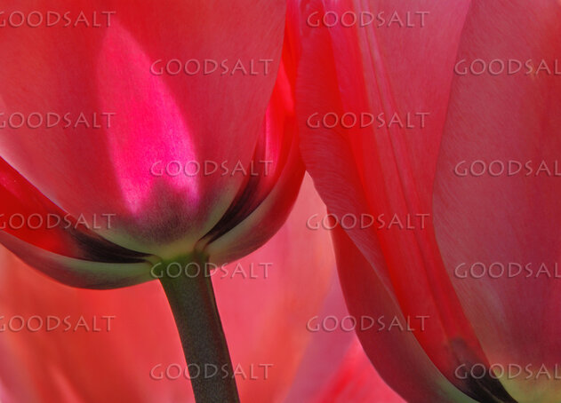 Looking from underneath a bed of pink tulips by Mary Lane Anderson