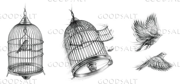 Black and white picture of two birds in a cage escaping while another bird in another cage looks on by Darrel Tank