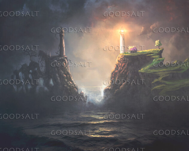 A bright shining light house and another which is burned out on a seaside landscape. by Kevin Carden