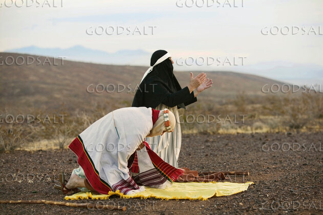 Two men kneeling to pray. Man in foreground wears white robe with red trim by Erik Stenbakken