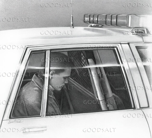 Man sitting in back of police car under arrest by Darrel Tank