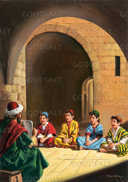 Hebrew children learn the bible and law from a rabbi. 4 boys. Daniel and his friends are captives in Babylon and learn under the kings court. by Review & Herald Publishing