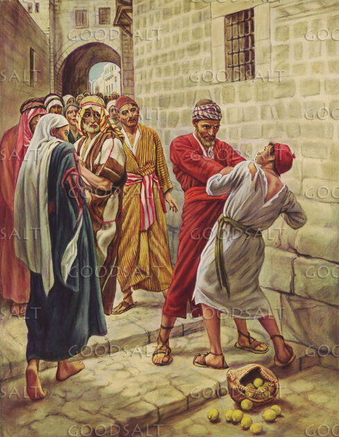 Matthew 1823 “Therefore the kingdom of heaven may be compared to a king who wished to settle accounts with his servants.24 When he began to settle, one was brought to him who owed him ten thousand talents.25 And since he could not pay, his master ordered him to be sold, with his wife and children and all that he had, and payment to be made.26 So the servant fell on his knees, imploring him, ‘Have patience with me, and I will pay you everything.’27 And out of pity for him, the master of that servant released him and forgave him the debt.28 But when that same servant went out, he found one of his fellow servants who owed him a hundred denarii, and seizing him, he began to choke him, saying, ‘Pay what you owe.’29 So his fellow servant fell down and pleaded with him, ‘Have patience with me, and I will pay you.’30 He refused and went and put him in prison until he should pay the debt.31 When his fellow servants saw what had taken place, they were greatly distressed, and they went and reported to their master all that had taken place.32 Then his master summoned him and said to him, ‘You wicked servant! I forgave you all that debt because you pleaded with me.33 And should not you have had mercy on your fellow servant, as I had mercy on you?’34 And in anger his master delivered him to the jailers, until he should pay all his debt.35 So also my heavenly Father will do to every one of you, if you do not forgive your brother from your heart.” | |