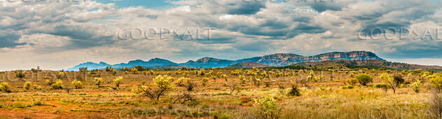 Scrubby trees in spring flower with distant huge rock ranges. by Mal Austin