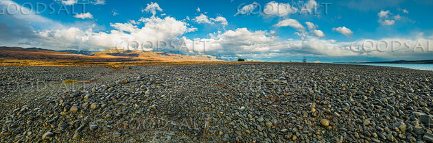 Vast stoney lake shoreline with mountains at rear. by Mal Austin