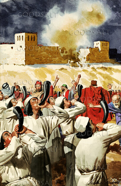 Joshua 61 Now Jericho was shut up inside and outside because of the people of Israel. None went out, and none came in.2 And the LORD said to Joshua, “See, I have given Jericho into your hand, with its king and mighty men of valor.3 You shall march around the city, all the men of war going around the city once. Thus shall you do for six days.4 Seven priests shall bear seven trumpets of rams' horns before the ark. On the seventh day you shall march around the city seven times, and the priests shall blow the trumpets.5 And when they make a long blast with the ram's horn, when you hear the sound of the trumpet, then all the people shall shout with a great shout, and the wall of the city will fall down flat, and the people shall go up, everyone straight before him.”6 So Joshua the son of Nun called the priests and said to them, “Take up the ark of the covenant and let seven priests bear seven trumpets of rams' horns before the ark of the LORD.”7 And he said to the people, “Go forward. March around the city and let the armed men pass on before the ark of the LORD.”8 And just as Joshua had commanded the people, the seven priests bearing the seven trumpets of rams' horns before the LORD went forward, blowing the trumpets, with the ark of the covenant of the LORD following them.9 The armed men were walking before the priests who were blowing the trumpets, and the rear guard was walking after the ark, while the trumpets blew continually.10 But Joshua commanded the people, “You shall not shout or make your voice heard, neither shall any word go out of your mouth, until the day I tell you to shout. Then you shall shout.”11 So he caused the ark of the LORD to circle the city, going about it once. And they came into the camp and spent the night in the camp.12 Then Joshua rose early in the morning, and the priests took up the ark of the LORD.13 And the seven priests bearing the seven trumpets of rams' horns before the ark of the LORD walked on, and they blew the trumpets continually. And the armed men were walking before them, and the rear guard was walking after the ark of the LORD, while the trumpets blew continually.14 And the second day they marched around the city once, and returned into the camp. So they did for six days.15 On the seventh day they rose early, at the dawn of day, and marched around the city in the same manner seven times. It was only on that day that they marched around the city seven times.16 And at the seventh time, when the priests had blown the trumpets, Joshua said to the people, “Shout, for the LORD has given you the city.17 And the city and all that is within it shall be devoted to the LORD for destruction. Only Rahab the prostitute and all who are with her in her house shall live, because she hid the messengers whom we sent.18 But you, keep yourselves from the things devoted to destruction, lest when you have devoted them you take any of the devoted things and make the camp of Israel a thing for destruction and bring trouble upon it.19 But all silver and gold, and every vessel of bronze and iron, are holy to the LORD; they shall go into the treasury of the LORD.”20 So the people shouted, and the trumpets were blown. As soon as the people heard the sound of the trumpet, the people shouted a great shout, and the wall fell down flat, so that the people went up into the city, every man straight before him, and they captured the city.21 Then they devoted all in the city to destruction, both men and women, young and old, oxen, sheep, and donkeys, with the edge of the sword.22 But to the two men who had spied out the land, Joshua said, “Go into the prostitute's house and bring out from there the woman and all who belong to her, as you swore to her.”23 So the young men who had been spies went in and brought out Rahab and her father and mother and brothers and all who belonged to her. And they brought all her relatives and put them outside the camp of Israel.24 And they burned the city with fire, and everything in it. Only the silver and gold, and the vessels of bronze and of iron, they put into the treasury of the house of the LORD.25 But Rahab the prostitute and her father's household and all who belonged to her, Joshua saved alive. And she has lived in Israel to this day, because she hid the messengers whom Joshua sent to spy out Jericho.26 Joshua laid an oath on them at that time, saying, “Cursed before the LORD be the man who rises up and rebuilds this city, Jericho. “At the cost of his firstborn shall he lay its foundation, and at the cost of his youngest son shall he set up its gates.”27 So the LORD was with Joshua, and his fame was in all the land. | |