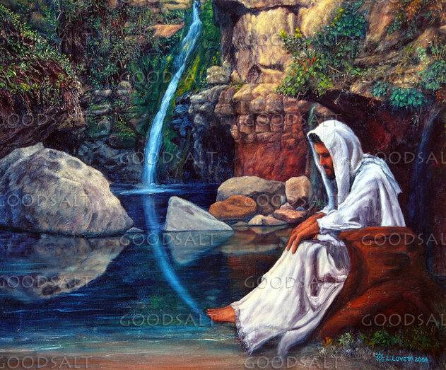 Jesus is our Water of Life. He takes time to be alone with the Father in a grotto with a waterfall. His feet are refreshed as he dips them into the cool water and touches the reflection.